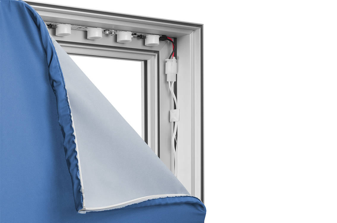 Gebruik een blockout doek in het kanaal aan de binnenzijde van het frame voor een betere reflectie van het licht en profiteer daarmee van een logistiek voordeel, er is geen onhandig zware reflectiewand meer nodig.
