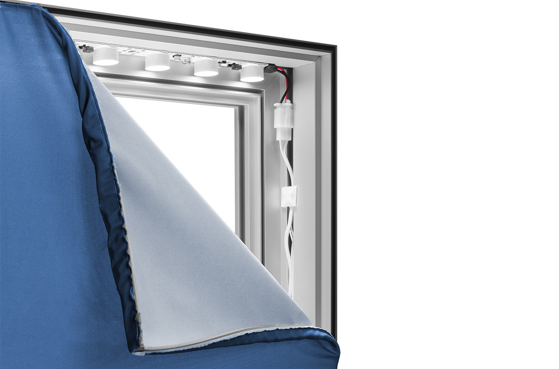 Gebruik een blockout doek in het kanaal aan de binnenzijde van het frame voor een betere reflectie van het licht en profiteer daarmee van een logistiek voordeel, er is geen onhandig zware reflectiewand meer nodig.