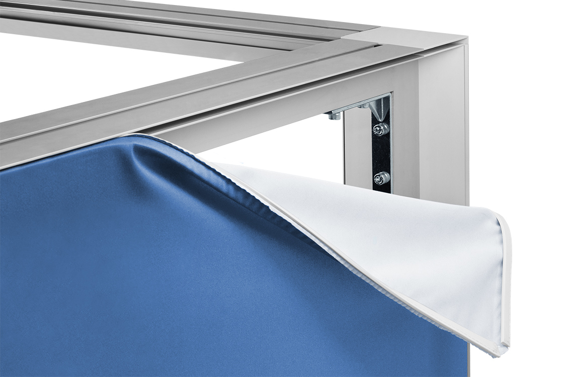Het is ook mogelijk om de L-vorm op te hangen waardoor een spectaculaire banner wordt gecreëerd.