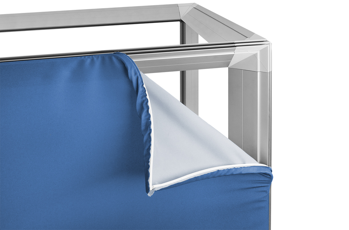 Laat de textielprints zien van alle kanten! Dit 3D textielframe wordt gebruikt voor meerder doeleinden. Bijvoorbeeld als display of showcase in showrooms of op beurzen. Of creëer een eyecatcher en hang de Cube 65 aan het plafond.