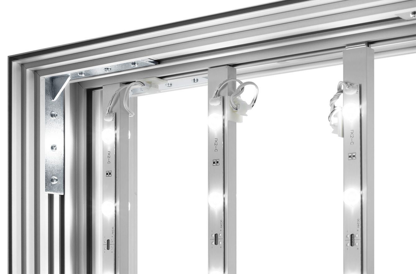 LED op stabilizer wordt aanbevolen bij grote formaten om zeker te zijn van een egale lichtverdeling. De platte LEDs zijn gemonteerd op stabilizers die op hun beurt het frame weer verstevigen. Elke maat is dankzij de stabilizers mogelijk.