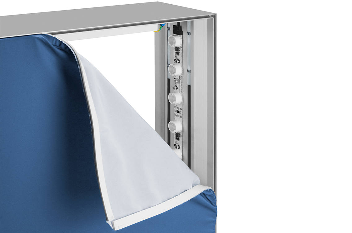 LED op stabilizer wordt aanbevolen voor extreem grote formaten om zeker te zijn van een egale lichtverdeling. Het verlicht de textielprint vanaf de achterkant met LED gemonteerd op stabilizers.